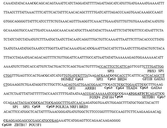 The Ciferritin sequence for DNA methylation detection. The bold letters indicate the “CpG1–10” loci, and the predicted transcription factor binding sites are underlined.