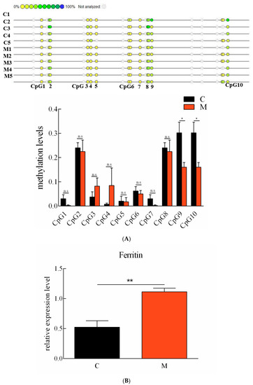 Methylation levels of “CpG” loci and mRNA expression levels of Ciferritin in grass carp individuals of different resistance. (A) Ferritin promoter “CpG” loci methylation levels, and (B) mRNA expression level comparison in the progeny of ordinary and maternal immunized grass carp. An asterisk (*) denotes a significant differences (p < 0.05), ** indicates p < 0.01, and n.s indicates no significant difference (p > 0.05). Letter C indicates progeny from ordinary grass carp, and M represents progeny from maternal immunized grass carp.
