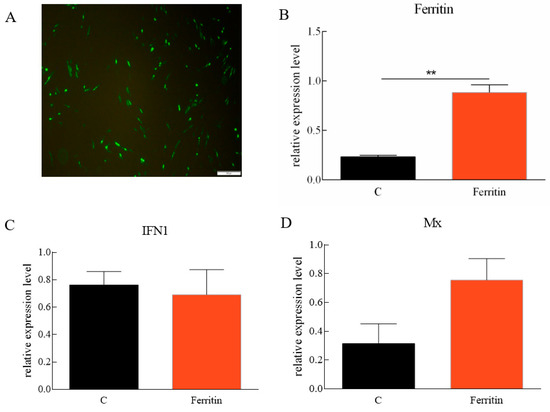 For the overexpression experiment, the open reading frame of Ciferritin was PCR-amplified with primer pairs Ferritin OF and Ferritin OR (Table 1). The total volume of PCR reactions was 50 µL, including 1 µL TransStart FastPfu Fly DNA polymerase (TransGen, Beijing, China), 10 µL 5× TransStart FastPfu Fly Buffer, 1 µL primer Ferritin-OF, 1 µL primer Ferritin-OR, 4 µL dNTPs, 2 µL cDNA template (spleen-originated template for qPCR) and 31 µL ddH2O. The PCR programs were one cycle at 95 °C for 2 min, 40 cycles at 95 °C for 20 s, 60 °C for 20 s and 72 °C for 30 s, and 72 °C for 5 min. The pEGFP-N1-Flag vector (Clontech, Palo Alto, CA, USA) and ORF PCR product were digested with BamHI and EcoRI, separately. The recombinant vector pEGFP-N1-Flag-Ferritin was constructed by cloning the purified ferritin ORF products into the pEGFP-N1-Flag vector, and the recombinant vector pEGFP-N1-Flag-Ferritin was sequence-verified. The pEGFP-N1-Flag- Ferritin was introduced into CIK cells. The experimental procedures were as follows: CIK cells were seeded into 25 cm2 cell culture flasks for 24 h with a minimum essential medium containing 10% FBS. A mixture of 8 µg plasmid, 16 µL P3000 and 15 µL lipofectamine 3000 (Invitrogen, Carlsbad, CA, USA) with 500 µL Opti-MEM medium were transferred into cells. Then, the transfection reagent was replaced with a fresh minimum essential medium at 6 h after transfection. At 48 h after overexpression, the cells were infected by GCRV JX-0901, and cells were sampled at 24 h post GCRV infection. The mRNA level of Ciferritin, CiIFN1, CiMx, VP2, and VP7 in pEGFP-N1-Flag-Ferritin overexpressed CIK cells were all detected by qPCR, and the primers are shown in Table 1. The relative GCRV Vp7 protein levels in cells at 24 h after GCRV infection were detected by Western blot, with a procedure similar to Li et al. [53]. For Vp7 protein detection, the Vp7 polyclonal antibody (diluted 1:1000 in PBS) and the secondary antibody HRP-conjugated goat anti-mouse IgG (Abclonal, Wuhan, Hubei, China, 1:2000 in 1 × TBST) were applied in the Western blot experiment. For the β-actin protein detection, the β-actin polyclonal antibody and goat anti-rabbit IgG were adopted.