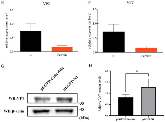 pEGFP-N1-Flag-Ferritin was successfully expressed in CIK cells (Figure 8A). At 48 h after Ciferritin overexpression, the CIK cells were infected by GCRV. At 24 h post infection, the expression levels of Ciferritin, CiIFN1, CiMx, Vp2, and Vp7 were all evaluated by qPCR. The mRNA level of Ciferritin was significantly up-regulated in the overexpression experimental group at 24 h after GCRV infection. However, the CiIFN1 and CiMx showed no significant differences between the Ciferritin overexpressing group and control group cells. For the viral content detection, the gene expression levels of VP2 and VP7 from GCRV were detected, and it was found that both Vp2 and Vp7 expressions were down-regulated in the Ciferritin overexpression CIK cells (Figure 8A–F). The protein level of GCRV VP7 level was also significantly lower in pEGFP-Ciferritin overexpressing cells (0.8182 ± 0.1066) than those in pEGFP-N1 transfected cells (1.2655 ± 0.3345) (p < 0.05) (Figure 8G,H).