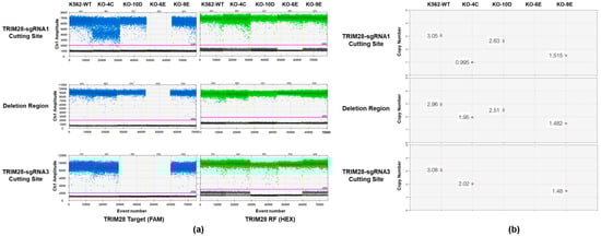 We used 50 ng of total genomic DNA from WT K562 Cell or each TRIM28-KO clone to determine the copy number of functional TRIM28 in the genome by the ddPCR method. The ddPCR was performed using a QX200™ Droplet Digital™ PCR System (Bio-Rad, Hercules, CA, USA) with QX200™ ddPCR™ EvaGreen® Supermix (Bio-Rad). Four probe and primer sets were designed, including ddPCR TRIM28_Left and ddPCR TRIM28_Right for the double-strand break site of TRIM28-sgRNA1 and TRIM28-sgRNA3, respectively, ddPCR TRIM28_Middle as the specific deletion region, and ddPCR TRIM28_Ref., a specific intact TRIM28 gene, as a reference.