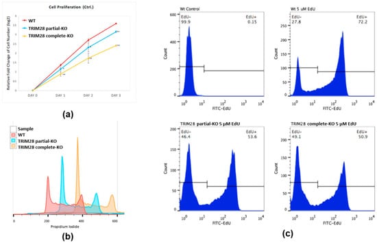 The expression level of TRIM28 regulates K562 cell proliferation. (a) The cell proliferation of WT, partial-KO and complete-KO K562 was determined by cell counting. Values are derived from an average of three independent experiments at the indicated time points. Data were normalized to day 0 (2 × 105) and used Log2-fold change as cell duplication rate. * p < 0.05; ** p < 0.01 comparison to the WT K562 cells. (b) The cellular DNA content of WT, partial-KO, and complete-KO K562 was analyzed by flow cytometry. (c) EdU labeling showing proliferation of WT, partial-KO, and complete-KO cells.