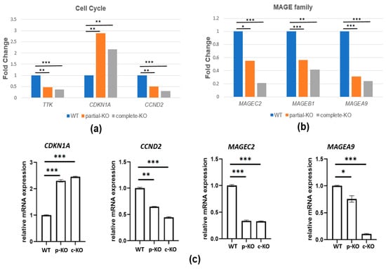 To explore the molecular mechanism of TRIM28-mediated cell proliferation in K562 cells a, we used the Affymetrix Clariom D assay, Human microarray platform to reveal the change in gene expression of the transcriptome profiling in WT, TRIM28 partial- and complete-KO K562 cells. The results showed a TRIM28 dosage-dependent change of several genes, which were demonstrated to be involved in the cell cycle progression, especially in BCR-ABL CML (e.g., CDKN1A (p21) and CCND2 (Cyclin D2)), which all responded to the G1/S phase progression (Figure 4a). Additionally, the MAGEA, B, and C protein families comprise class I MAGEs, a group of highly homologous proteins whose expression is suppressed in all normal tissues except developing sperm [], and function as drivers of tumorigenesis []. As shown in Figure 4b, the mRNA expression levels of MAGEA9, B1, and C2 were downregulated in TRIM28 KO cells depending on the expression levels of TRIM28. Their gene expression levels were verified by RT (reverse transcription)-qPCR (quantitative PCR) (Figure 4c). The results were consistent with the microarray analysis, indicating that TRIM28 might play functions in cell proliferation via controlling related gene expression.