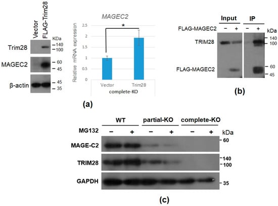 TRIM28 involves in MAGEC2 mRNA expression. (a) Overexpression of Trim28 in TRIM28 complete-KO K562 cells rescues MAGEC2 mRNA and protein expression. * p < 0.05. (b) Immunoprecipitation of FLAG-MAGEC2 with TRIM28 in HEK293T cells. (c) MAGEC2 protein expression under MG132 treatment. The WT, TRIM28 partial-KO, and complete-KO K562 cells were treated with 20 μM of MG132 for 6 h and whole cell extracts were isolated for Western blotting analysis using indicated antibodies.