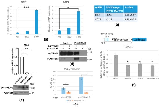 TRIM28 regulates HBE mRNA expression via SOX6 transcription repressor. (a) RT-qPCR analysis. RNAs from WT, TRIM28 partial-KO, and complete-KO K562 cells were subjected to RT-qPCR with HBE, HBG, and GAPDH primers. (b) The HBE and SOX6 mRNA expression in microarray analysis. (c) The rescue analysis. The TRIM28 complete-KO K562 cells were transfected with FLAG-SOX6 or FLAG-Trim28. After drug selection, RNAs were isolated for RT-qPCR analyses with HBE cDNA primers (upper panel) and whole-cell extracts were Western blotted with indicated antibodies (lower panel). (d) Co-IP of TRIM28 and SOX6. The FLAG-SOX6 and HA-TRIM28 expression plasmids were transfected as indicated into HEK293T cells. The whole-cell extracts were IPed with anti-FLAG and Western blotting with anti-HA and anti-FLAG. (e) ChIP assay. The WT, partial-KO, and complete-KO cells were fixed by formaldehyde and IPed with anti-TRIM28 or anti-SOX6. The precipitated genomic DNA was qPCR analyzed with HBE promoter primers. (f) Luciferase assay. The HBE promoter-driven luciferase expression vector was co-transfected with FLAG-SOX6, HA-TRIM28, or FLAG-SOX6 and HA-TRIM28 together and then luciferase activity was measured. All experiments were independently repeated three times, and * p < 0.05, ** p < 0.01, and *** p < 0.001.