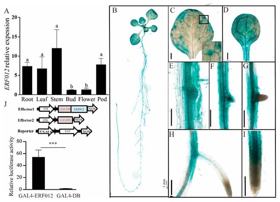 Tissue expression and transactivation assay of Arabidopsis ERF012. (A) Expression levels of ERF012 in different tissues. Thirty-five-day-old Arabidopsis was used for qRT-PCR analysis. Letters indicate significant differences between different tissues: Duncan’s test (p < 0.05). (B–I) Expression pattern analysis of ERF012 in seedlings. Twelve-day-old seedling expressing pERF012:GUS was used. A close-up was indicated by a black frame in (C). Scale bar = 100 μm in (C–I). (J) Transactivation assay of ERF012 genes in protoplast. GAL4-ERF012 is the effector and GAL4-LUC is the reporter. GAL4-DB is the control. The values are means ± SD, n = 5. Asterisks indicate significant differences between different treatments: Student’s t-test, *** p < 0.001.