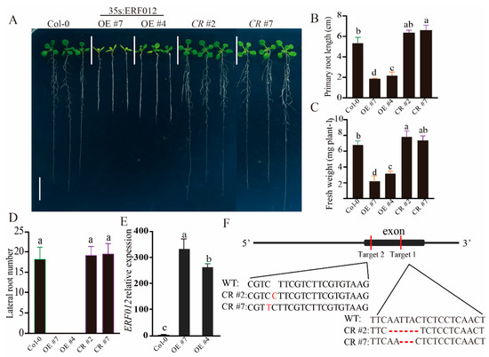 ERF012 regulates plant growth and development. (A) Phenotypical comparison of Col-0, ERF012 overexpression in plants and erf012 mutants. Twelve-day-old seedlings grown on 1/2 MS solid medium were imaged, scale bar = 1 cm. (B–D) The primary root length, shoot fresh weight and the lateral root number were statistically measured in (A), n = 18 plants. (E) Validation of ERF012-OE plants by qRT-PCR analysis; n = 3 pools, with about 20 plant roots per pool. (F) Mutation information of ERF012 in its exon sequence established by a CRISPR/Cas9 system. Letters in (B–E) indicate significant differences between different plants: Duncan’s test (p < 0.05).