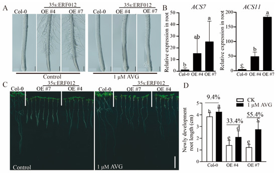 Short root tips and high root hair density are the typical characteristics of excess ethylene in plant roots. Compared to Col-0, the roots of ERF012-OE plants developed shorter root tips and dense root hair (Figure 5A), indicating the high ethylene level in ERF012-OE roots. To investigate whether ethylene is involved in the root growth of ERF012-OE plants, we compared the expression levels of the ethylene precursor and biosynthetic gene 1-aminocyclopropane-1-carboxylic acid (ACC) synthase (ACS) between Col-0 and ERF012-OE plants. Two ERF012-OE lines had significantly higher expression levels of ACS7 and ACS11 than in Col-0 (Figure 5B), suggesting ethylene accumulation in ERF012-OE lines. We further used an ethylene biosynthesis inhibitor to estimate the involvement of ethylene in the root growth of ERF012-OE lines. AVG treatment largely improved the root growth of ERF012-OE lines (Figure 5C). The root tips were elongated and root hair density was dramatically reduced in the AVG-treated ERF012-OE lines (Figure 5B–D). These results demonstrate that ERF012 expression enhances ethylene biosynthesis, leading to root growth inhibition.