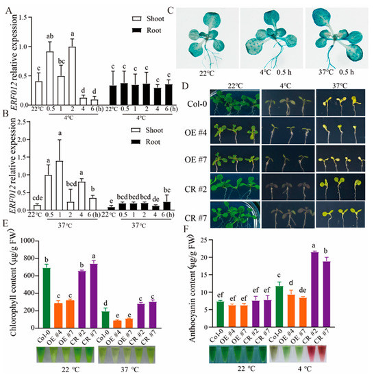 ERF012 responds to temperature dynamics. (A,B) Time-course analysis of ERF012 expression exposed to 4 °C or 37 °C for 0.5 h, 1 h, 2 h, 4 h, 6 h. Twelve-day-old seedlings were used for qRT-PCR. Values represent means ± SD, n = 3 pools, with 12 seedlings per pool. Letters indicate significant differences between different plants: Duncan’s test (p < 0.05). (C) GUS staining of pERF012:GUS seedlings exposed to C for 0.5 h. (D) The shoot phenotype of 6-day-old Col-0, ERF012-OE lines and erf012 mutant lines at 4 °C or 37 °C. Six-day-old seedlings grown at 22 °C were transferred to 4 °C or 37 °C for 6 days of growth. (E,F) The chlorophyll content (37 °C treatment) and anthocyanin content (4 °C treatment) of all plants were statistically calculated. Values represent means ± SD, n = 4 pools, with 5 shoots per pool. Letters indicate significant differences between different plants: Duncan’s test (p < 0.05).