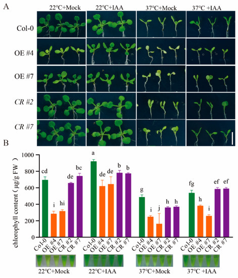 To estimate the responses of ERF012 to environmental stresses, temperature dynamics were first tested. Col-0 seedlings grown under normal conditions (22 °C) were transferred to high temperatures (37 °C) or low temperatures (4 °C) for several hours. Time-course qRT-PCR analysis of ERF012 expression in the shoots and roots was performed. The rapid responses (within 2 h) to dynamics were observed for Col-0 shoots, whereas no significant changes occurred in the roots (Figure 6A,B). The consistent results were confirmed by pERF012:GUS lines treated at different temperatures (Figure 6C), suggesting that ERF012 plays a critical role in shoots under temperature dynamics. To validate the involvement of ERF012 expression in shoot response to temperature dynamics, Col-0, erf012 mutants and ERF012-OE lines were phenotypically compared at different temperatures. At normal conditions (22 °C), ERF012-OE shoots had lower chlorophyll content than the Col-0 and erf012 mutants, corresponding to visible chlorosis (Figure 6D,E). High temperature (37 °C) largely reduced the chlorophyll content in all plants with chlorosis, although the ERF012-OE lines still had the lowest levels (Figure 6D,E). Interestingly, the chlorosis of ERF012-OE lines at 22 °C and all plants at 37 °C can be lightened largely by the IAA supply (Figure 7A,B). In contrast, the low-temperature treatment (4 °C) did render growth retardation (Figure 6D) and the erf012 mutants accumulated the highest anthocyanin content and ERF012-OE lines accumulated the lowest anthocyanin content (Figure 6D,F). Anthocyanin accumulation is usually an adaptation strategy of plants to low temperatures [34]. Thus, ERF012 expression disturbed anthocyanin biosynthesis, leading to reduced low-temperature tolerance. These results indicate that ERF012 expression negatively regulates Arabidopsis adaptation of temperature dynamics.
