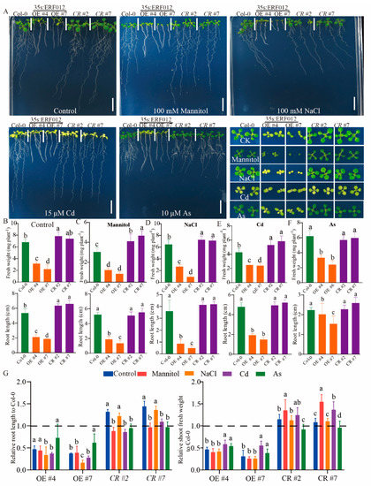 ERF012 reduces plant sensitivity to various abiotic stresses. (A) The phenotypical comparison of Col-0, ERF012-OE lines and erf012 mutant lines. Six-day-old seedlings grown on 1/2 MS medium were transferred to the medium with 100 mM mannitol, 100 mM NaCl, 10 μM arsenite and 15 μM CdCl2 for 6 days of growth. (B–F) The shoot fresh weight and primary root length were statistically calculated. (G) The relative primary root length of Col-0 and relative shoot fresh weight of Col-0 under each stress were statistically calculated. (B,G) Values represent means ± SD, n = 4 pools, with 5 shoots per pool. Letters indicate significant differences between different plants: Duncan’s test (p < 0.05). Dotted lines (G) indicate the relative Col-0 root length and relative Col-0 shoot fresh grown in normal conditions.
