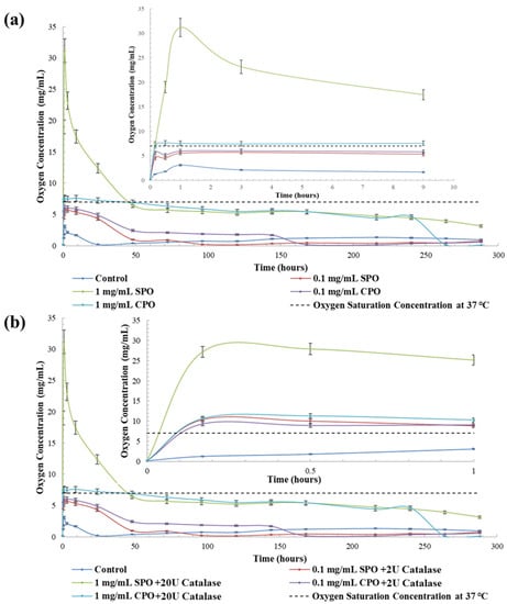 Oxygen-generating materials have been used in different tissue engineering applications; however, the optimum oxygen release rates required for these applications differ. For example, wound-healing applications require a fast and relatively short oxygen release to prevent tissue necrosis after severe injuries; however, for engineered tissues or organs, a long-term and stable oxygen release is necessary to maintain cell viability and tissue functionality before the vascularization process is complete [,,]. In our release studies of SPO and CPO, we observed that SPO had a burst oxygen release, while CPO had a more stable oxygen release than SPO, which was expected due to the different chemical decomposition kinetics of SPO and CPO [,]. In addition, 1 mg/mL of SPO and 1 mg/mL CPO could maintain the oxygen level close to the saturation level under hypoxic conditions for 10 days, as shown in Figure 1a. With the presence of catalase, the oxygen-producing reactions of SPO and CPO became much faster, showing an undersaturated oxygen level after one day, as shown in Figure 1b. This correlated well with our knowledge that the presence of catalase can accelerate the decomposition of hydrogen peroxide, resulting in faster oxygen release [].