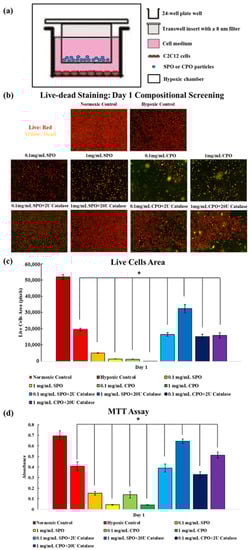 (a) Schematic of the novel in vitro cell-culture-insert setup. (b) Live–dead staining of C2C12 cells cultured for 24 h in different concentrations of SPO and CPO, as well as different concentrations of SPO/catalase and CPO/catalase. All samples were cultured under hypoxic conditions except the normoxic control. Red indicates living cells and yellow indicates dead cells. (c) The images were analyzed to quantify the area occupied by cells dyed red, indicating the living cell population. This measurement is compared across each treatment condition. (d) MTT assay results from different conditions after culturing for one day.