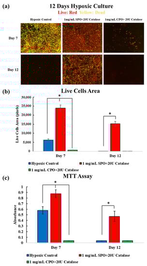 Moreover, samples with 1 mg/mL SPO/20 U catalase and 1 mg/mL CPO/20 U catalase were further tested for extended time points in vitro. As shown in Figure 3a–c, significantly increased numbers of live cells were observed along with significantly increased MTT levels in the 1 mg/mL SPO/20 U catalase samples at days 7 and 12. However, samples cultured with 1 mg/mL CPO/20 U catalase showed cytotoxic effects and detached from the well plate, while demonstrated significantly lower cell viability in the same assays. Both samples were assessed in comparison with the hypoxic control.