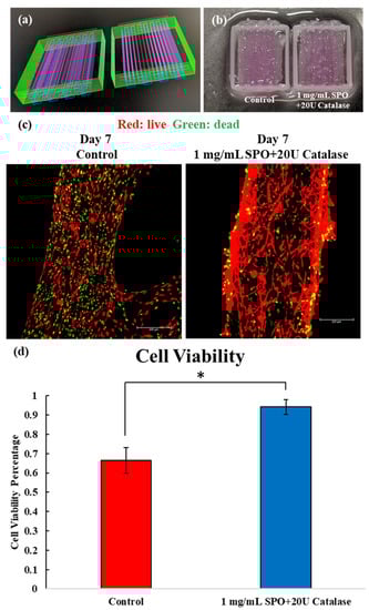 We further encapsulated 1 mg/mL SPO/20 U catalase into fibrinogen-based hydrogels as the bioink for bioprinting applications. Results showed that this novel bioink could be bioprinted onto complex artificial muscle models for further evaluations, as shown in Figure 4a. Additionally, for the 1 mg/mL SPO/20 U catalase, significantly improved cell viability was observed from the live–dead staining images and significantly higher MTT activity detected compared to the control after culturing under the hypoxic condition for 7 days, as shown in Figure 4b,c. However, under these circumstances, cellular preservation under the hypoxic condition was not as potent as in the previous results. The reason might have been related to the significantly enhanced cell density used in the cell-laden bioink. For bioprinting applications, a high cell density at the beginning of the culture is essential for the proliferation and functionalization of tissue constructs, but here it resulted in a higher consumption of oxygen, leading to less dominant effects on the preservation of cell viability.