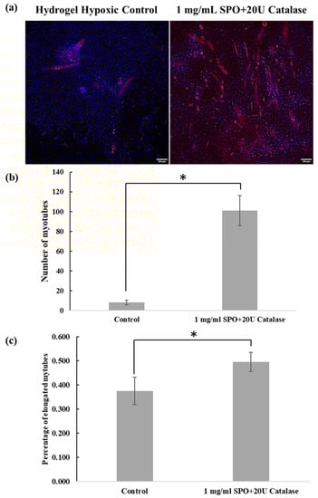 Samples with hydrogel inserts were further tested for their differentiation ability after transferal from hypoxic conditions to normoxic conditions. The differentiation capacity was assessed by myosin staining of differentiated myotubes. Following 15 days under hypoxic conditions, cells in the hydrogel with 1 mg/mL SPO/20 U catalase stained positive for myotubes after being transferred to normoxic conditions and continued exhibiting proliferation and differentiation for 8 days; however, cells in the hydrogel hypoxic control showed weak evidence of well-differentiated myotubes, as shown in Figure 5a. In addition, the number of myotubes and the elongated myotube percentage from the hydrogel with 1 mg/mL SPO/20 U catalase were significantly higher than the control, as shown in Figure 5b–c.