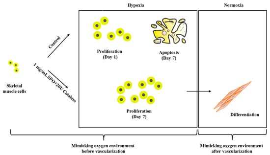 Schematic of cell preservation using 1 mg/mL SPO + 20 U catalase to mimic an oxygen environment before and after vascularization.