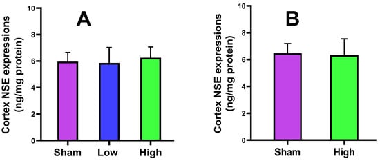Effect of tDCS-iTBS on cortex NSE expressions (ng/mg protein): (A) short-term (n = 15) and (B) long-term stimulations (n = 16).