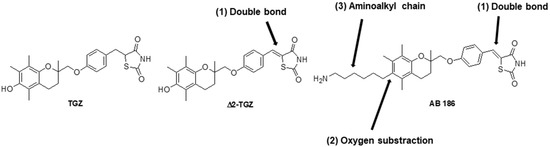 AB186 is a new TGZ derivative which possesses, in addition to the double bond adjoining the thiazolidine-2,4-dione ring as in ∆2-TGZ, a deoxygenation of the chromane heterocycle and a hydrophobic aminoalkyl moiety (Figure 1).