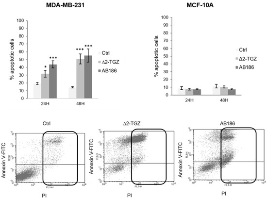 In a previous study, we demonstrated that Δ2-TGZ induced apoptosis after 24 h of treatment in MDA-MB-231 breast cancer cells but not in non-tumorigenic mammary cells MCF-10A [21]. We exposed these cells to 4 µM of AB186, a dose that was just above the cell viability IC50 that we previously measured in MDA-MB-231 [14]. AB186 also led significantly to the apoptosis of MDA-MB-231 breast cancer cells but not of MCF-10A cells (Figure 2). After 24 h of exposure, 4 µM of AB186 induced 44% of apoptotic cells while 20 µM of Δ2-TGZ was required to obtain 32% of apoptotic cells. Likewise, after 48 h of treatment, Δ2-TGZ and AB186 induced 51% and 55% of apoptotic cells respectively. Thus, AB186 (4 µM) induced a higher or similar apoptosis rate at a five-fold lower dose compared to Δ2-TGZ (20 µM) in these breast cancer cells.
