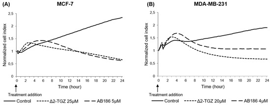MCF-7 (8 × 103 cells/well) and MDA-MB-231 (4 × 103 cells/well) cells were seeded into 96-wells microelectronic standard E-plate and grown for 29 h before exposure to DMSO, Δ2-TGZ, or AB186. MCF-7 and MDA-MB-231 cells attachment, proliferation, and size variations were monitored in real-time and measured as impedance using the xCELLigence system (Real Time Cell Analyzer Single Plate (RTCA SPH) system) (Roche Applied Science, Mannheim, Germany) [34]. Cell index (CI) is an arbitrary unit representing the result of the impedance induced by adherent cells to the electron flow. CI was calculated as follows: CI = (impedance at time point n-impedance in the absence of cells)/nominal impedance value. Background impedance of the E-Plate was first determined before seeding the cells by the addition of 50 µL culture medium to each well and subtracted automatically by the RTCA software following the equation: CI = (Zi − Z0)/15 with Zi as the impedance at any given time point and Z0 as the background signal. Impedance measurements were performed every 15 min.