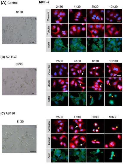 In order to test this hypothesis, we analyzed by immunofluorescence the morphology of MCF-7 and MDA-MB-231 cells using three cytoskeletal components: actin, α-tubulin, and vimentin after 2 h 30 min, 4 h 30 min, 8 h 30 min, or 10 h 30 min of treatment. The control MCF-7 cells displayed a cobblestone-like phenotype with strong cell–cell adhesion (Figure 4A). In response to Δ2-TGZ and AB186, MCF-7 cell morphology was altered by changes in cell shape and size (Figure 4B,C). We observed some elongated cells around 4 h 30 min of exposure to Δ2-TGZ and AB186 and some shrunken cells with condensed chromatin after 8 h 30 min of treatment. At 10 h 30 min of treatment, almost all cells were shrunken.
