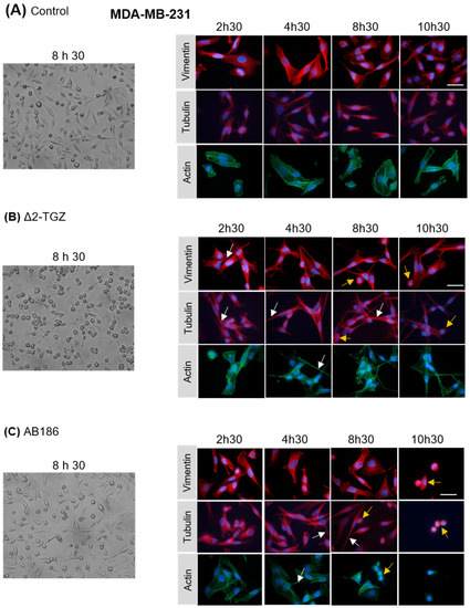 TGZ derivatives alter MDA-MB-231 morphology. MDA-MB-231 cells were treated with DMSO as control (A), 20 µM of Δ2-TGZ (B) or 4 µM of AB186 (C) during 2 h 30 min, 4 h 30 min, 8 h 30 min and 10 h 30 min. Then, cells were subjected to immunofluorescence analysis and stained with antibodies raised against vimentin, α-tubulin and actin. Cell nuclei were labelled with Hoechst dye. Bright field pictures of control and treated cells are also shown after 8 h 30 min. Elongated cells (white arrows) and some shrunken cells (yellow arrows) were observed. Bar represents 50 µm.