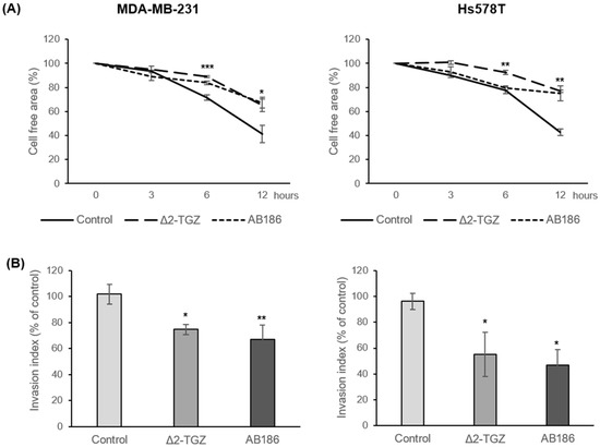 MDA-MB-231 (6 × 105 cells/well) and Hs578T (2 × 105 cells/well) were seeded in 6-well plates for 24 h until 90% of confluence. A scratch was made with a 200 µL pipette tip through the cell monolayer and cells were treated with Δ2-TGZ or AB186 for 0, 3, 6, or 12 h. Wound closure was observed as previously described [35].