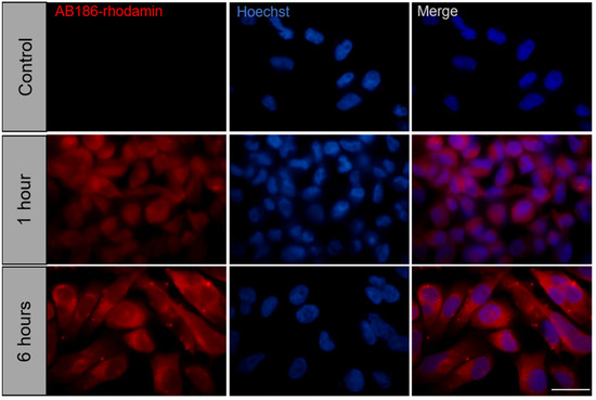 Rhodamin-labelled AB186 localizes in the cytoplasm of MDA-MB-231 cells. MDA-MB-231 cells were exposed to 3 µM of Rhodamin-labelled AB186 during 1 or 6 h. Control cells were exposed to the unlabeled compound. Cells were fixed with paraformaldehyde and cell nuclei were labelled with Hoechst dye. Bar represents 50 µm.