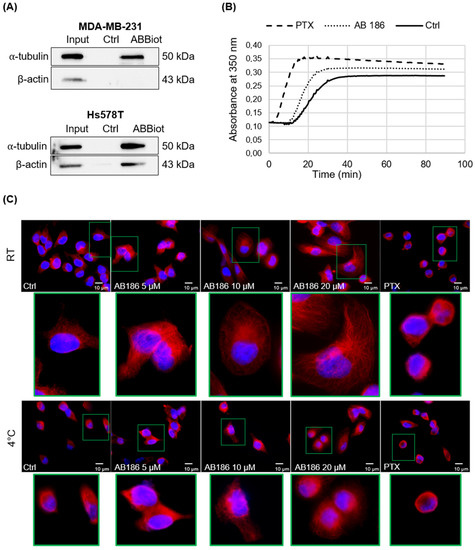 By pull-down assay, we validated that biotinylated AB186 (ABBiot) binds to α-tubulin in MDA-MB-231 and Hs578T cells while the interaction between AB186 and β-actin was observed only in MDA-MB-231 cells (Figure 8A). No clear interaction was confirmed with moesin and talin. In addition, AB186 promotes tubulin polymerization into microtubules in vitro. Indeed, tubulin polymerization started earlier compared to the control condition (Figure 8B). AB186 displayed a different profile compared to paclitaxel, well-known to promote microtubule assembly and affect microtubule dynamics. In the presence of AB186, the accumulation of polymerized tubulin started later than in the presence of paclitaxel. The morphology of microtubules was then examined in breast cancer cells by immunofluorescence microscopy (Figure 8C). At room temperature (RT), AB186 induced a dose-dependent enlargement of tubulin network, with elongated microtubules. By contrast, after paclitaxel treatment microtubules were more condensed and reorganized into thick ring-like bundles near the nucleus. Experiments were also performed at 4 °C since cold treatment is known to induce depolymerization of microtubules [24]. As expected, in control cells, the microtubule network was altered by cold treatment. In the presence of paclitaxel, control treatment, no network remodeling was observed between RT and 4 °C conditions. Interestingly, AB186 treatment induced a dose-dependent stabilization of the network compared to control cells, suggesting an active role on the microtubule through binding to α-tubulin (Figure 8C).
