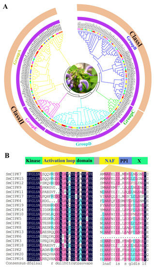 To identify members of the CIPK family in S. miltiorrhiza, the following three steps were taken. First, the HMM models of Pkinase (PF00069) and NAF (PF03822) were downloaded from the Pfam database (http://pfam.xfam.org/, accessed on 5 August 2021), and through the software HMMER3 [40] (http://www.hmmer.org, accessed on 5 April 2022) to search the protein database (E-value < 0.01), respectively. Second, using the Arabidopsis thaliana CIPK family protein sequences as the query, we set the E value to 1 × 10−10 using ncbi-blast+ v2.8.1 software, compared to the protein database, and counted the results with identity greater than or equal to 50%. Third, combining the results of the above two steps, the non-redundant sequences were uploaded to the Pfam database, and the SMART database (http://smart.embl-heidelberg.de/, accessed on 5 August 2021) was further analyzed to determine whether CIPK contains conserved domains. Ip (isoelectric point) and MW (molecular weight) analysis were performed using the online website (http://web.expasy.org/protparam/, accessed on 14 October 2021) and subcellular localization prediction was accomplished by http://www.csbio.sjtu.edu.cn/bioinf/Cell-PLoc-2/, accessed on 14 October 2021. The amino acid sequences and nucleic acid sequences of SmCIPKs are in Supplementary File S1.