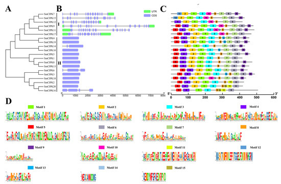 Phylogenetic relationship, gene structure and conserved motif analysis of SmCIPKs. (A). Phylogenetic tree of SmCIPKs. (B). Schematic diagram of intron and exon structures of SmCIPKs. Blue boxes represent exons, green boxes represent untranslated regions, and straight lines represent introns. (C,D). The different colored boxes represent different conserved motifs and specific amino acid sequences.