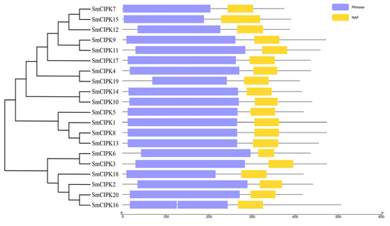 Structural characterization of the CIPK gene family of S. miltiorrhiza was performed according to the order of gene arrangement in the evolutionary tree (Figure 2A). In the gene structure diagram (Figure 2B), the SmCIPK genes were found to be between 1.2–7.5 kb in length, with 11–14 intron numbers for the six SmCIPKs in group I, two introns for SmCIPK14 and SmCIPK6, three intron numbers for SmCIPK16, and 0 intron numbers for the remaining 11 SmCIPKs in group II. As shown in Figure 2C, the analysis of MEME sites showed that all 6 SmCIPKs in the first group contained motif 10, and only SmCIPK18 in the second group did. SmCIPK2, SmCIPK20 and SmCIPK16 in the second group are evolutionarily related, and they all contain motif 11. Additionally, all except SmCIPK7, SmCIPK15 and SmCIPK12 contain motif 5. Therefore, these results suggest that motif 5, motif 10 and motif 11 may enrich the diversity of CIPKs in S. miltiorrhiza. Equally, these SmCIPKs had similar motif arrangements and motif numbers in different subgroups, indicating that the protein structures were conserved in the same subgroup, but the specific functions of the conserved motifs need to be further investigated. Undoubtedly, the conserved domain analysis showed that among the 20 SmCIPK proteins, all members had typical Pkinase and NAF domains except for SmCIPK16, whose domain Pkinase was split into two segments (Figure 3).
