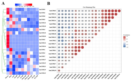 Expression pattern analysis of SmCIPKs. (A). Heat map of SmCIPKs expression in different tissues under different treatments. (B). Correlation analysis of the expression patterns between different SmCIPKs. Red color indicates positive correlation between two genes, blue color indicates negative correlation between two genes, and the number in each cell indicates the correlation coefficient. (Correlations > 0.5 were considered significant).