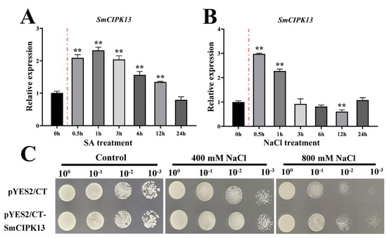 Expression analysis of SmCIPK13 under SA and NaCl treatment and characterization of its function in yeast. (A,B). SmCIPK13 was induced at expression levels of 0, 1, 2, 3, 6, 12 and 24 h by 80 µM SA and 150 mM NaCl. (C). Growth of yeast that have been transformed with SmCIPK13 grown in SD/-Ura, SD/-Ura medium containing 400 mM and 800 mM NaCl. (** p < 0.01).