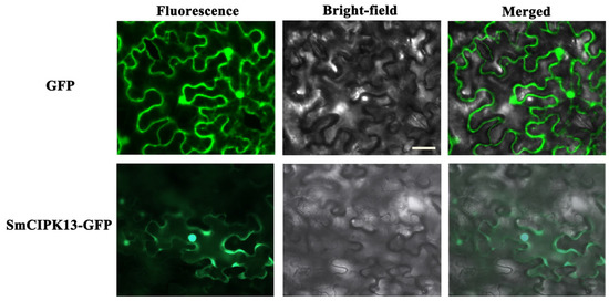 Subcellular localization of SmCIPK13 in tobacco. The scale represents 100 µm.