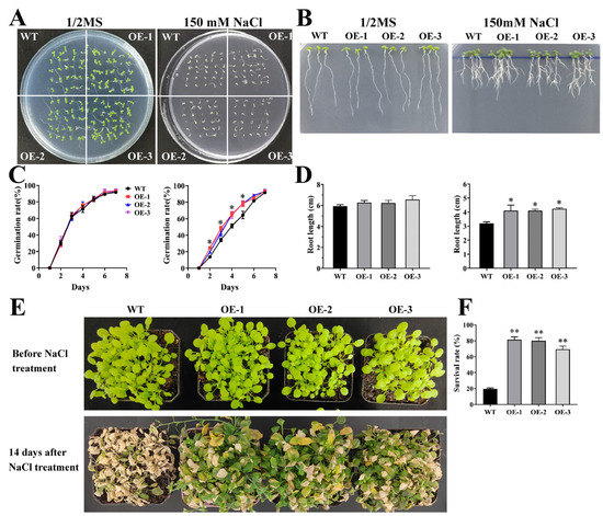 T3 generation homozygous transgenic Arabidopsis lines were obtained by plate screening on 1/2 MS medium containing 50 mg/mL hygromycin and detection at the molecular level by PCR [45]. For the seedling phenotyping experiment under salt stress, transgenic lines (OE-1, OE-2, and OE-3) and WT (wild type) were grown to the fourth week (24 °C, 16 h/8 h, light/dark). Subsequently, the phenotype was observed and the survival rate was calculated after 150 mM NaCl treatment for two weeks.