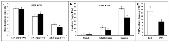 Comparison of the plant hormone, photosynthetic product, and ATP contents. (a) IAA, GA and ABA contents; (b) starch, soluble sugar and sucrose contents; and (c) ATP contents. Note: The different lowercase letters indicate significant differences at the p < 0.05 level.