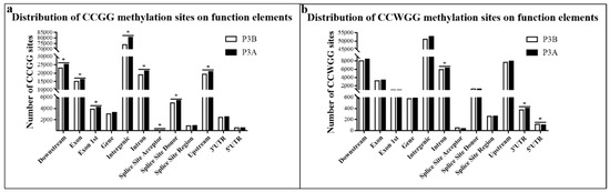 Distribution of methylation sites in different functional elements. (a) CCGG sites; (b) CCWGG sites. Note: The asterisk indicates significant differences at the p < 0.05 level.