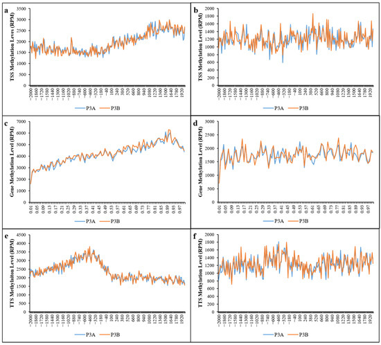 The distribution of methylation sites 2 kb upstream and downstream of the transcription start site (TSS), 2 kb upstream and downstream of the transcription termination site (TTS) and in gene-coding regions was analyzed. The results (Figure 3 and Table S1) showed that the distribution of methylation sites in the gene-coding region was significantly higher than that in the upstream and downstream 2 kb regions of the TSS and TTS, and the methylation level of P3A in the gene-coding region was lower than that of P3B. These results imply that the gene-coding region of kenaf had a higher DNA methylation level, and the DNA methylation level in the male sterile line P3A was lower than that in its maintainer line P3B, which may be one of the reasons for CMS.