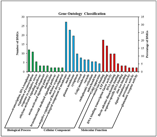 GO enrichment analysis showed that 79 DMGs were highly enriched in 68 GO terms. The total enriched GO terms are shown in Table S3, and the top ten GO terms in each category are shown in Figure 4. In the biological process category, DMGs were mostly enriched in regulation of transcription, auxin-activated signaling pathway, methylation, negative regulation of flower development and ethylene-activated signaling pathway. In the cellular component category, integral component of membrane, cytoplasm, endoplasmic reticulum, and mitochondrion were highly enriched. In the molecular function category, DMGs were highly enriched in ATP binding, DNA binding and peroxidase activity.