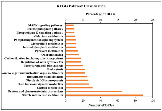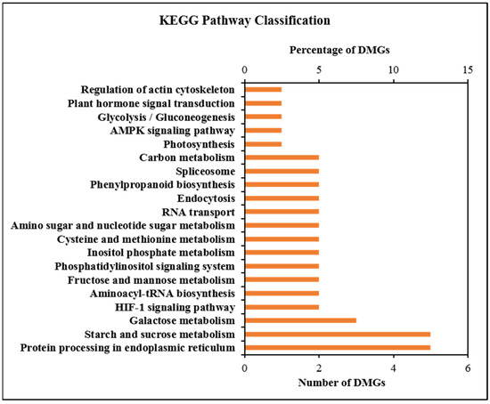 KEGG pathway enrichment analysis showed 41 highly enriched DMGs that were distributed among 56 metabolic pathways (Table S3). The top 20 enriched pathways are shown in Figure 5. DMGs were involved in pathways such as starch and sucrose metabolism, plant hormone signal transduction, carbon metabolism, protein processing in endoplasmic reticulum, photosynthesis, glycolysis/gluconeogenesis, RNA polymerase, galactose metabolism, inositol phosphate metabolism, AMPK-signaling pathway and fructose and mannose metabolism, which play vital roles in the regulation of plant growth and development. Combined with the results of previous physiological indicators, this study showed that DNA methylation, especially DMGs, was involved in the regulation of carbon metabolism and plant hormone signal transduction.
