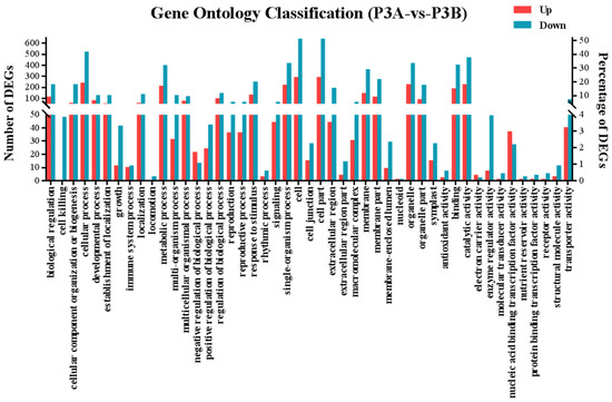 A total of 1788 genes were differentially expressed in P3A, including 558 (31.21%) up- and 1230 (68.79%) downregulated genes (Table S4). This result indicates that most of the DEGs showed a decreasing expression tendency in the CMS line P3A compared with the maintainer line P3B.