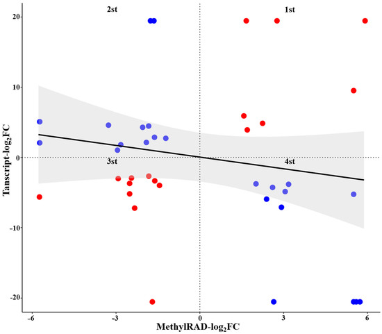 The correlation between differentially expressed genes (DEGs) and differentially methylated genes (DMGs). Note: Red dots indicate that the methylation level of the gene is negatively correlated with its expression level, and blue dots indicate that the methylation level of the gene is positively correlated with its expression level. The grey shadow indicates that the correlation between the methylation level and expression level is not significant (p > 0.05).
