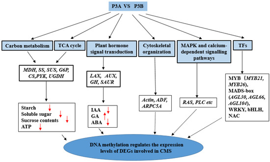 A model for the changes in DMGs and DEGs contributing to CMS in kenaf. Note: The upwards red arrowhead indicates that the content of this indicator is significantly increased in P3A, and the downwards red arrowhead indicates that the content of this indicator is significantly decreased in P3A. The solid line indicates that there has been sufficient and in-depth research, while the dotted line indicates that further in-depth research and verification are needed.