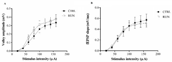 Basal synaptic transmission evaluation. Input-output of stimulus plots versus fiber volley amplitude (A) and stimulus versus fEPSP slope (B) in CTRL and RUN group. Field potential and fiber volley amplitude responses to increasing intensity stimuli of the perforant pathway were not significantly different in the two groups.