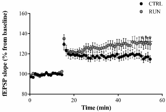 High-frequency stimulation of the perforant pathway elicited a robust LTP both in CTRL and in RUN groups (Figure 2). In slices from the RUN group, the evoked LTP was similar to that elicited in the CTRL group during the first 15 min, but fEPSP in RUN animals reached significantly higher values than controls, especially in the last minutes of recordings (Figure 2).