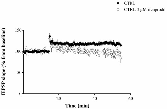 Long-term potentiation (LTP) in presence of ifenprodil. The slopes of the EPSP evoked by high-frequency stimulation in CTRL slices treated with 3 µM ifenprodil significantly decreased after recording for 40 min following; in addition, the y-intercept in the last 10 min of recording was significantly lower in the group treated with 3 µM ifenprodil group. Data statistical analysis: linear regression slope F = 128.141, p < 0.0001; y-intercept F = 566.889, p < 0.0001.
