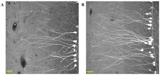 The images obtained were used to evaluate the total length of dendrites and the number of primary dendrites. To evaluate dendritic arborization, the images obtained in NeuronStudio were analyzed using NeuronJ. Sholl’s analysis was adopted to estimate dendrite arborization and was performed by Sholl’s Analysis Plugin (https://imagej.net/plugins/sholl-analysis, accessed on 17 June 2022) [74], using an 8-μm interval between concentric circles. Moreover, considering that throughout the development stages the newly-generated DG granules move from the subgranular zone (SGZ), located at the border of the granule cell layer facing hilus, where they originate, through the granular layer, the distance of each GFP-positive granule cell from the SGZ/hilus has been evaluated as an index of neuronal migration.