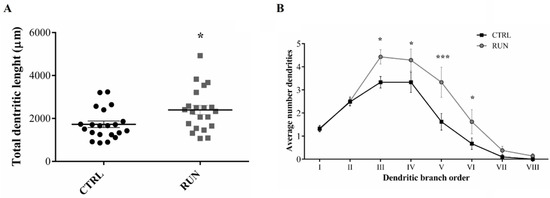 The measurement of the total dendritic length pointed out that dendrite extension was significantly higher in the RUN group than in CTRLs (Figure 5A). Moreover, despite the similar number of the I order dendrites between the two groups, a significantly higher number of III to VI order dendrites was observed in the RUN group (Figure 5B), suggesting higher dendritic complexity trees in the RUN group, as confirmed by Sholl’s analysis.